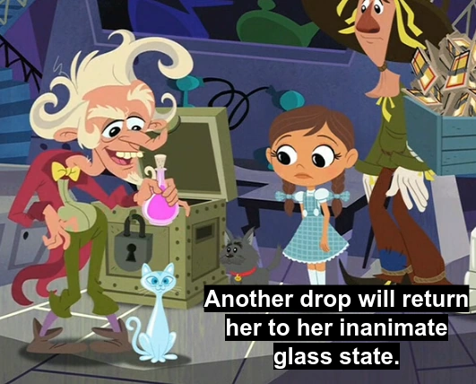 The Glass Cat guided the rescue party that saved Trot and Cap'n Bill from entrapment on the Magic Isle. (The Magic of Oz)