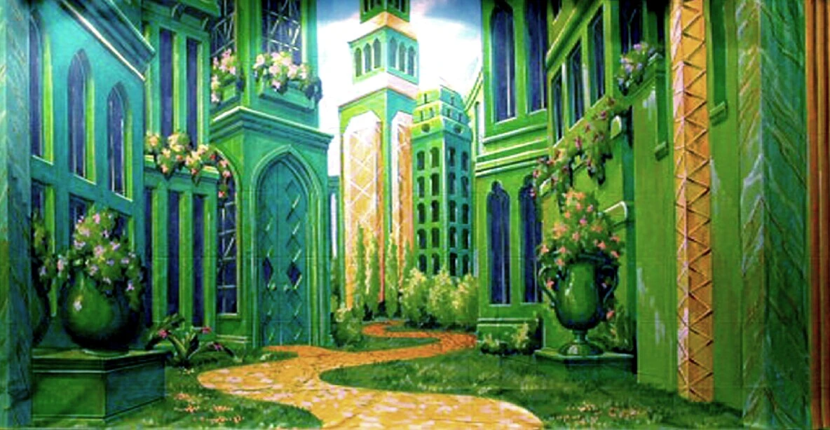Inside, all of the buildings are constructed out of hundreds of skyscraper cylinder domes of what appears to be of green marble and green glass. These odd looking towers and buildings are all crowded together. Inside of the city a horse of a different color, pulls a drawn carriage and takes guest on a tour of the city. All of the streets are polished and of dark green marble, some area's have velvet carpets. The green cylinder dome buildings have small windows and doors. Colorful gardens are seen with green watered ponds and beauty shops. The image was selected by MGM Art Department head Cedric Gibbons, from a tiny photo of a sketch in the studio's library. The work of a pre-1914 German artist, the picture suggested a city of upside-down test tubes - more abstract than the Moorish, Spanish styled version of the City that Denslow provided in the original book. Assistant art director Jack Martin Smith later explained that the MGM personnel chose the look because it did not resemble any known buildings in any style; "It looked like some strange but beautiful thing we had never seen before."