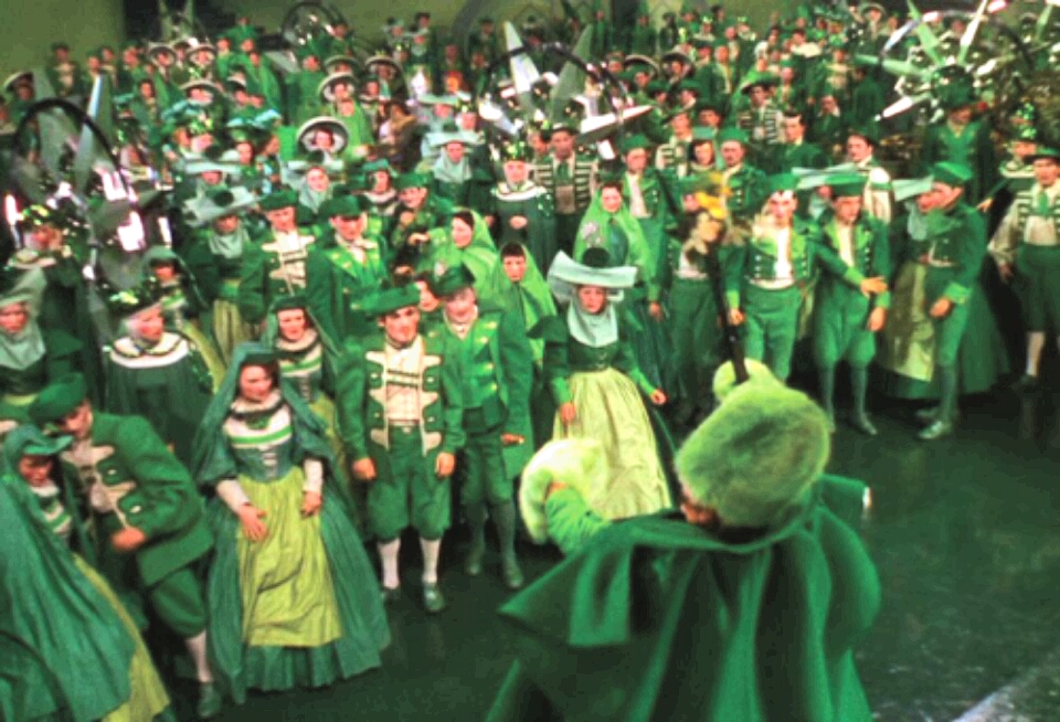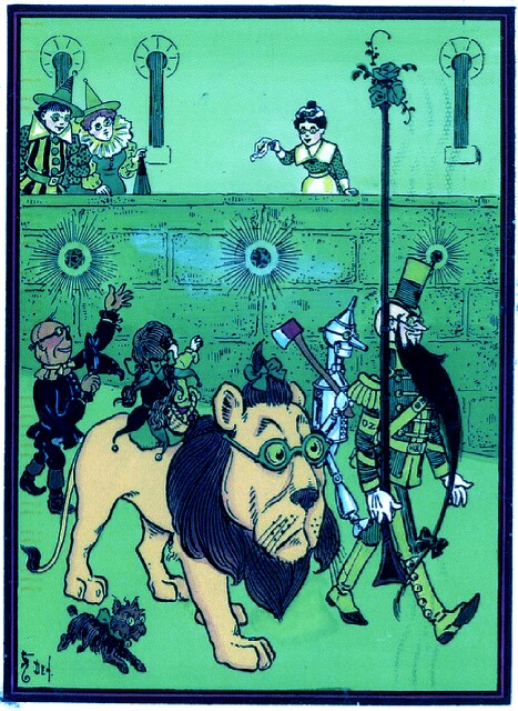 - "There were many people--men, women, and children--freely walking about the green streets, and they were all dressed in unique clothes of all green. Even their skin appeared to be of a light greenish tint. The men's outfits were decorated with emeralds for buttons and the women's attire was adorned with emerald brooches. They all stopped in their errands and looked at Dorothy and her strangely assorted company with wondering eyes, and the children all ran away and hid behind their mothers when they saw the Lion; but no one spoke to them. Many shops and stores stood in the streets, and Dorothy saw that everything in them was green. Green toys were on display in the green windows, and green candy and green popcorn were offered for sale, as well as green shoes, green hats, green bags and other green items of all sorts. On one corner of a busy street, a man was selling green lemonade, and when the children bought it, Dorothy could see that they all paid for it with shiny green pennies. "