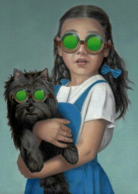 - "The little man opened the very big green box that was also decorated with emeralds, and Dorothy saw that it was filled with spectacles of every size and shape. All of them had green glasses in them. The Guardian of the Gates found a pair that would just fit Dorothy and put them over her eyes. There were two solid gold bands fastened to them that passed around the back of her head, where they were locked together by a little key that was at the end of a chain the Guardian of the Gates wore around his neck. When they were on, Dorothy could not take them off had she wished, but of course she did not wish to be blinded by the glory and brightness of the Emerald City, so she said nothing. Then the green man fitted spectacles for the Scarecrow and the Tin Woodman and the Lion, and even on little Toto; and all were locked fast with the key. Then the Guardian of the Gates put on his own glasses and told them he was ready to show them to the Palace. Taking a big golden key encrusted with jewels from a peg on the wall, he opened another gate, and they all followed him through the portal into the streets of the Emerald City."