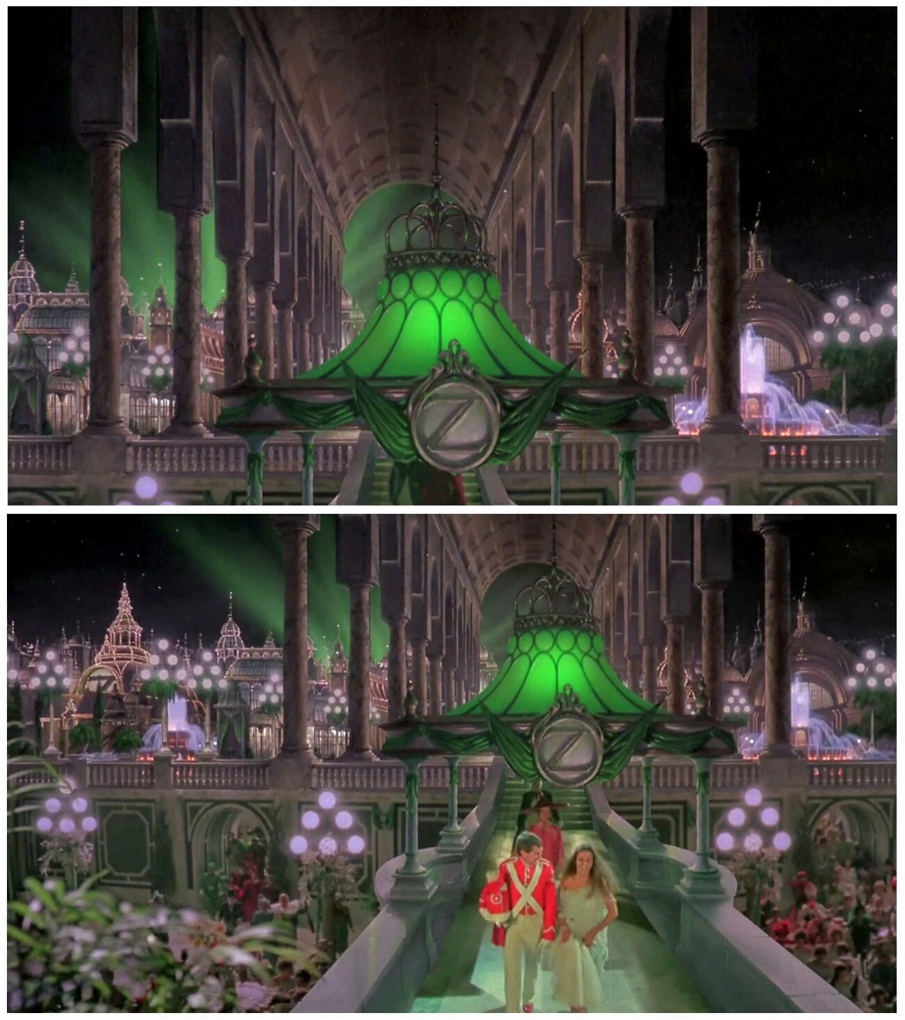 Even though the green city is in a state of apocalyptic ruins throughout the majority of the film, the viewer gets a tantalizing look into the city's lite up streets after Dorothy saves Oz and wishes Oz to be restored back to life. And during the celebration parade scene towards the very end, the scenes are all shot throughout the silver and gold carpeted hallways and mirrored throne room of Oz's royal palace.