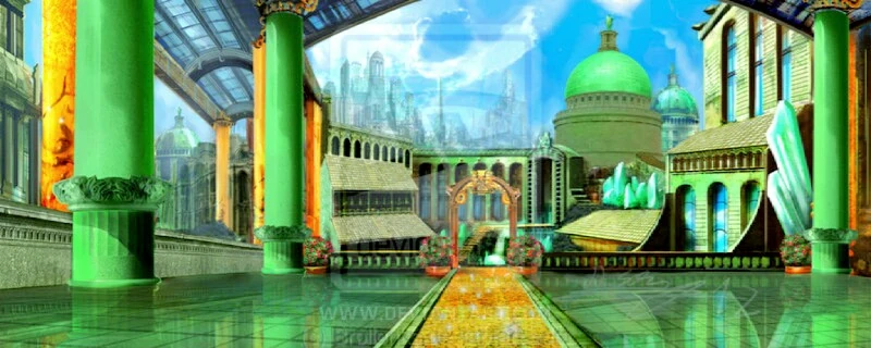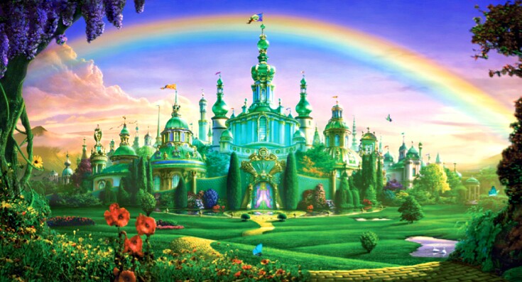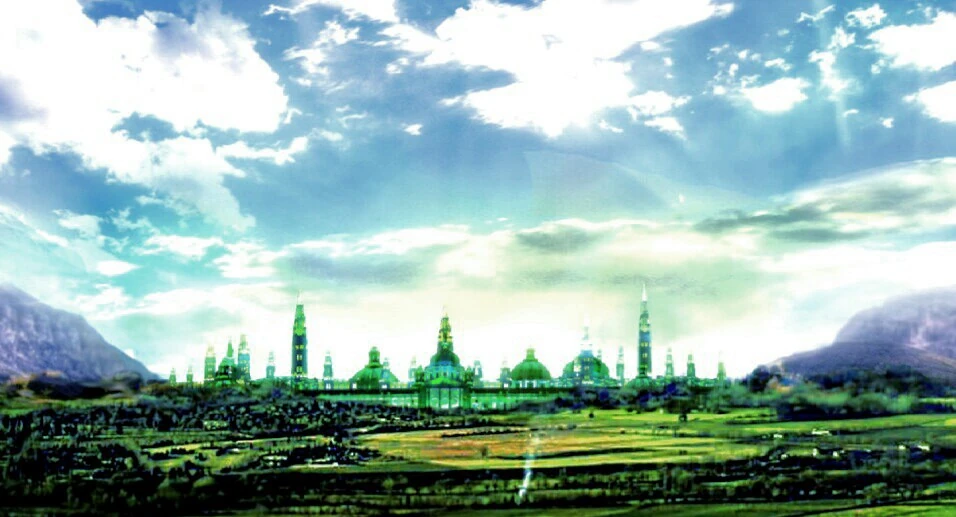 The City of Emeralds can be found at the very end of Oz's famous Yellow Brick Road. The road stops right at the emerald studded gates which is connected to the green marble wall that surrounds the entire city. The city is a magnificent place indeed, being described as stately, statuesque, imposing and even intimidating. The equal of which has never been seen or discovered, (even in other enchanted realms and fairylands.) In fact, it is so magnificent that a bright green glow can be seen far off into the distance many miles away that shines brightly high up, above the city and into the sky even in broad daylight. The closer you get to the city, the more its glow intensifies, and becomes brighter and brighter until everything surrounding the city, including the rays of the sun appear to be of a greenish tint.