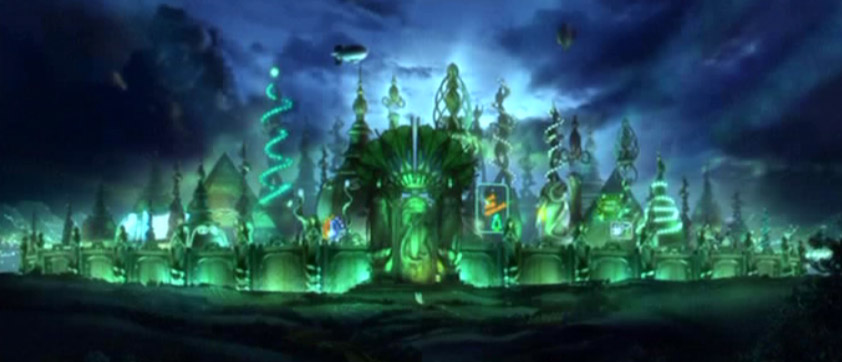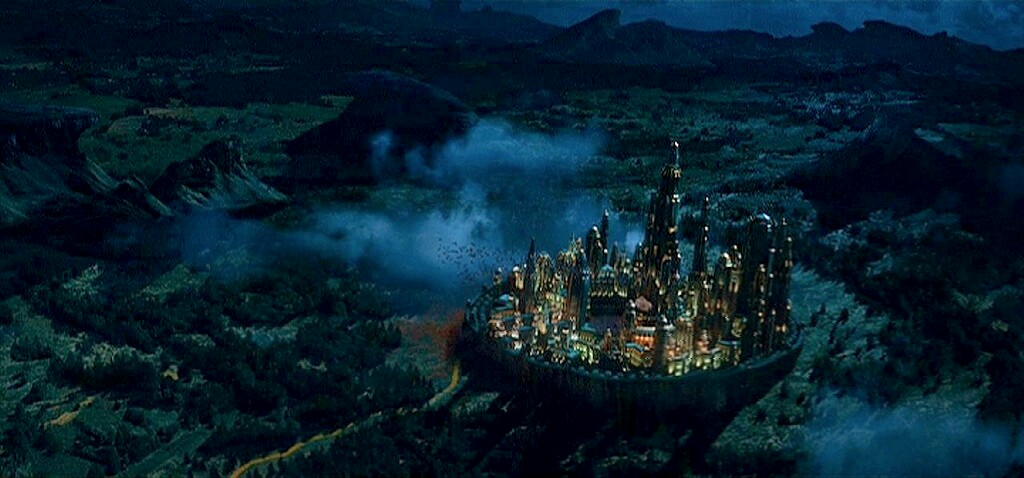 The Emerald City lite up at night as seen in Oz the Great and Powerful.