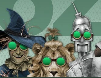 When the Emerald City was first built, the thick high wall of polished marble that surrounded the entire city was all green and covered with giant sparkling emeralds. However, the city itself, while mostly all green and still decorated with millions of big green jewels and precious gems was entirely not. Many other stones are used as decorations inside the buildings such as rubies, diamonds, and sapphires, yet outwardly only emeralds appear, which is why the place is called the Emerald City. But the Wizard still demanded that anyone who passed the city gates and entered into his emerald studded empire, wear green-tinted spectacles/eyeglasses. The glasses became mandatory by the Wizard's law and the people who became residents were all told they had to wear them for their own good. To keep the glasses in place, the glasses consist of two 24 Karat gold bands on each side that reach all the way around to meet at the back of the wearer's head. Then the two bands are securely locked on tight. As long as the gold bands are locked on the glasses are unable to be taken off, even if one wishes to do so. The citizens and visitors of Emerald City must wear them at all times, living with these spectacles on 24/7. They must eat, sleep, bathe and go about their daily routines while wearing them. Even the animals of Oz who come to Emerald City are expected to wear the green tinted eye wear. There is only one key that can lock/unlock these devices which the Guardian of the Gates wears on a thick solid gold chain around his neck.