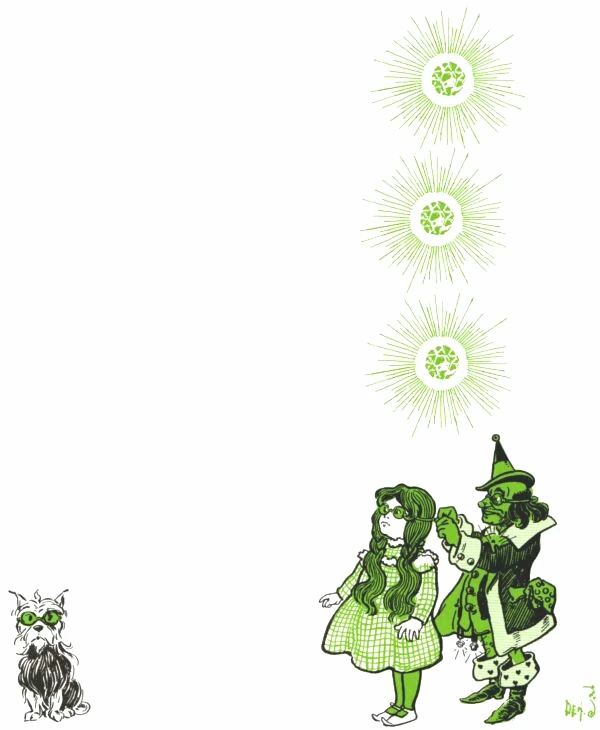 Guardian of the Gates adorns Dorothy and Toto with Green Spectacles. Illustration by W.W. Denslow circa 1900.