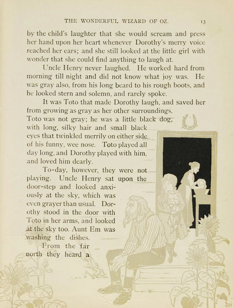 In The Wonderful Wizard of Oz, the story opens up with the first chapter titled The Cyclone and immediately introduces the reader to the main character and leading protagonist named Dorothy Gale, who lives on a small farm in the midst of the great Kansas prairies in circa 1899-1900 with her little pet dog named Toto and her two elder guardians, Uncle Henry and Aunt Em. During the time the book was written, Kansas was strictly a place for farming communities. It was also known for having powerful storms with deadly tornadoes that would destroy the farms and businesses of the impoverished settlers who came from all over the world (mainly parts of Europe and countries overseas such as New England, Ireland and Germany) to make their homes on the desolate prairies hoping to raise prosperous and healthy crops.