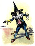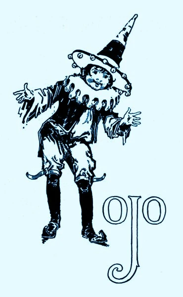Ojo is a typical Munchkin boy. He wears blue knee pants with gold buckles and blue silk stockings, a blue ruffled waist and a jacket of bright blue braided with gold. His blue leather shoes turn up at the pointed toes, and his hat has a peaked crown and a flat brim with a row of tiny bells.