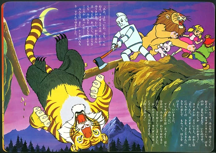 This picture-book Wizard contains only twelve pages and most of them are double page spreads, many of which are quite attractive, though the style is a bit cartoony. It also includes a small phonograph record (playing time about fifteen minutes) of the story, using different voices for each character and with Oz songs sung in Japanese.