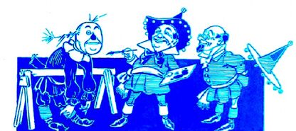 The Scarecrow is being made by two Munchkins. Illustration by W.W. Denslow circa 1900.
