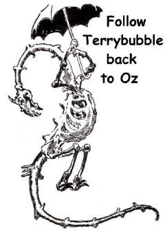 Terrybubble's form is that of a duckbill-type dinosaur, with a flat head, a long snake-like neck, short front legs and long back legs, and a powerful tail. Speedy calls it "a bit kangerooish" in appearance. When it is re-awakened to life, it is a moving skeleton, with "bright and intelligent balls of phosphorous" for eyes.