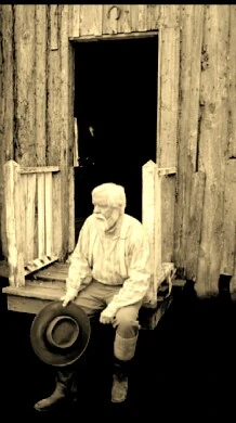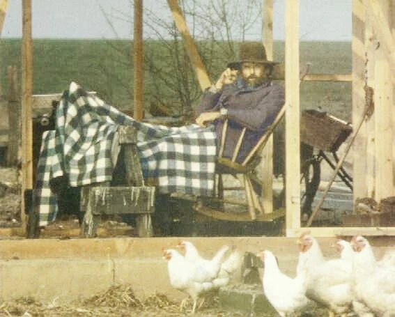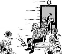 Uncle Henry sitting on the farmhouse front porch in Kansas with Dorothy, Toto, and Aunt Em (1900)