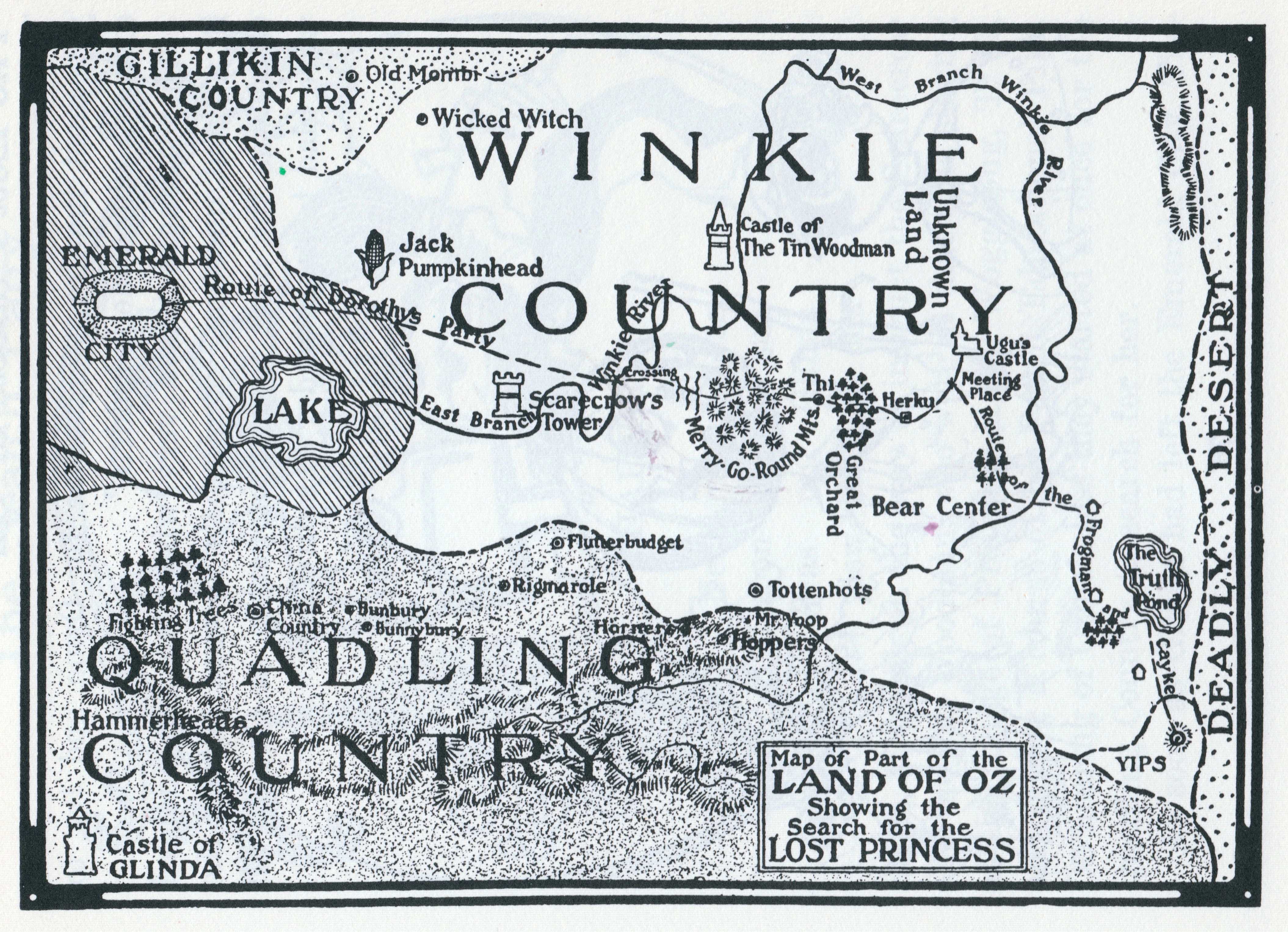 Like all the countries of Oz, the Winkie Country contains various unusual sights and places. Among them are: